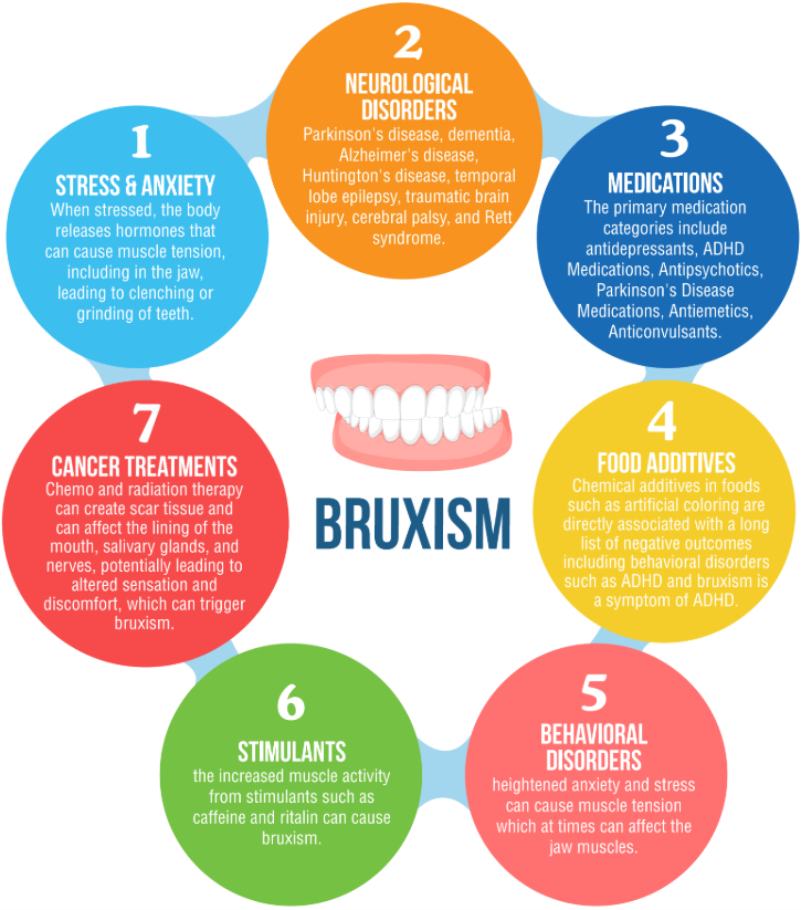 Chemical additives in foods such as artificial coloring are directly associated with a long list of negative outcomes including behavioral disorders such as ADHD and bruxism is a symptom of ADHD.
